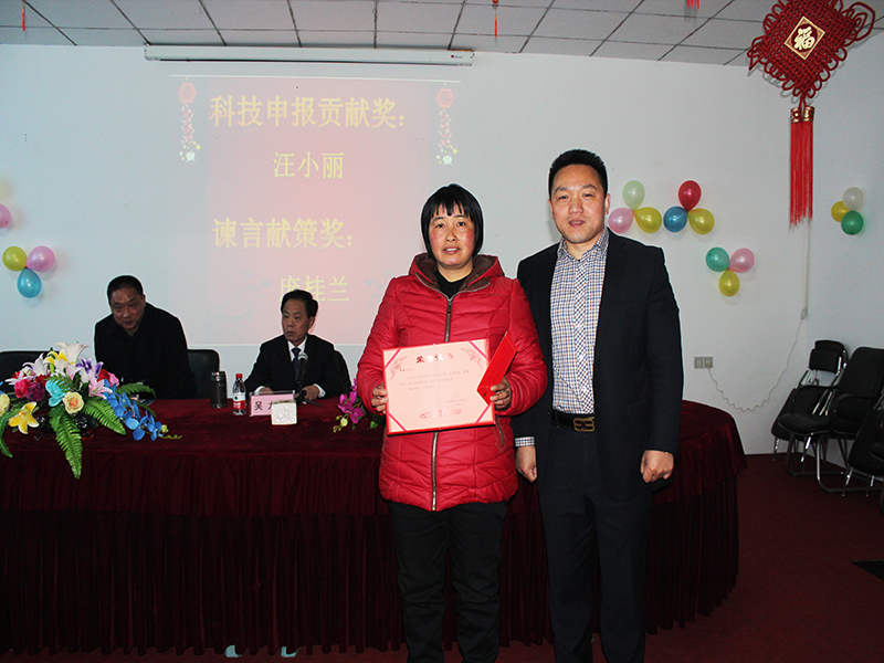 圖5 總經(jīng)理傅士超為員工汪小麗頒發(fā)科技申報貢獻獎并合影留念