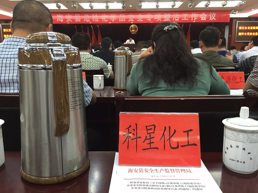 6月7日,海安縣危險化學品安全專項工作會議在縣政府報告廳舉行。 南通科星化工有限公司董事長吳龍鐵親自參加會議。