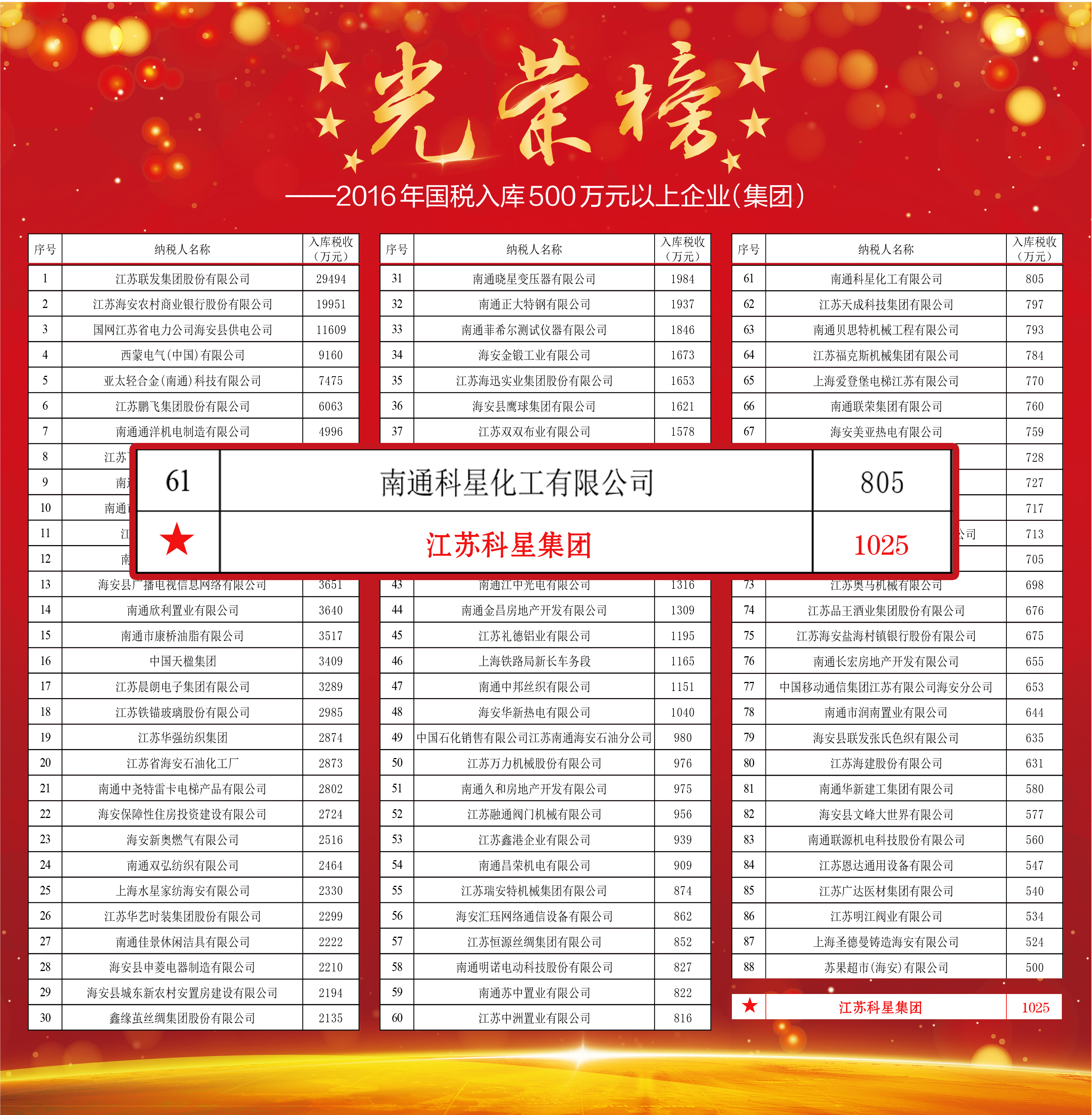 2016年,在縣委縣政府和南通市國(guó)稅局的正確領(lǐng)導(dǎo)下,江蘇科星集團(tuán)暨南通科星化工有限公司實(shí)現(xiàn)集團(tuán)公司稅收超千萬(wàn),堅(jiān)持以環(huán)保、安全、消防、質(zhì)量、節(jié)能、高效的經(jīng)營(yíng)理念,取得了驕人業(yè)績(jī)。