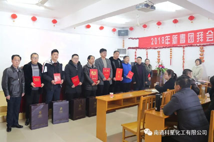 白甸鎮(zhèn)黨委副書(shū)記、鎮(zhèn)長(zhǎng)許栩親臨年會(huì)現(xiàn)場(chǎng)致賀辭。集團(tuán)董事長(zhǎng)吳龍鐵先生、科星公司總經(jīng)理傅士超先生等領(lǐng)導(dǎo)與會(huì)做報(bào)告。傅總經(jīng)理對(duì)上年度工作進(jìn)行了務(wù)實(shí)的總結(jié),表彰了工作表現(xiàn)優(yōu)秀的員工。吳董事長(zhǎng)展望2018年度預(yù)期銷售目標(biāo)達(dá)到2億元,制定了2019-2023年五年規(guī)劃:科星化工實(shí)現(xiàn)銷售收入5億元,江蘇科星新材料集團(tuán)累計(jì)銷售收入10億元,爭(zhēng)取創(chuàng)業(yè)板成功上市。