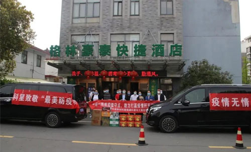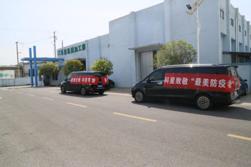 2022年4月9日下午,在白甸鎮黨委副書記、鎮長陸枳彤、副鎮長劉臻、郭勇等領導的陪同下,江蘇科星新材料暨南通科星化工股份有限公司執行總裁吳曉強率領慰問組人員將純凈水、方便面、自嗨鍋、冰糖心蘋果,以及毛巾和折疊躺椅等物資,分批次裝車送往疫情防控一線,為值守在那里的醫務工作者、隔離防疫工作者送去溫暖。