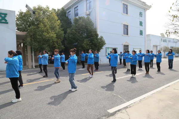 在生產基地的生活區(qū),全體女職工身著統(tǒng)一服裝,伴隨著激情昂揚的旋律,以整齊的動作、飄逸的舞步,淋漓盡致地展現(xiàn)了她們的活力和風采。