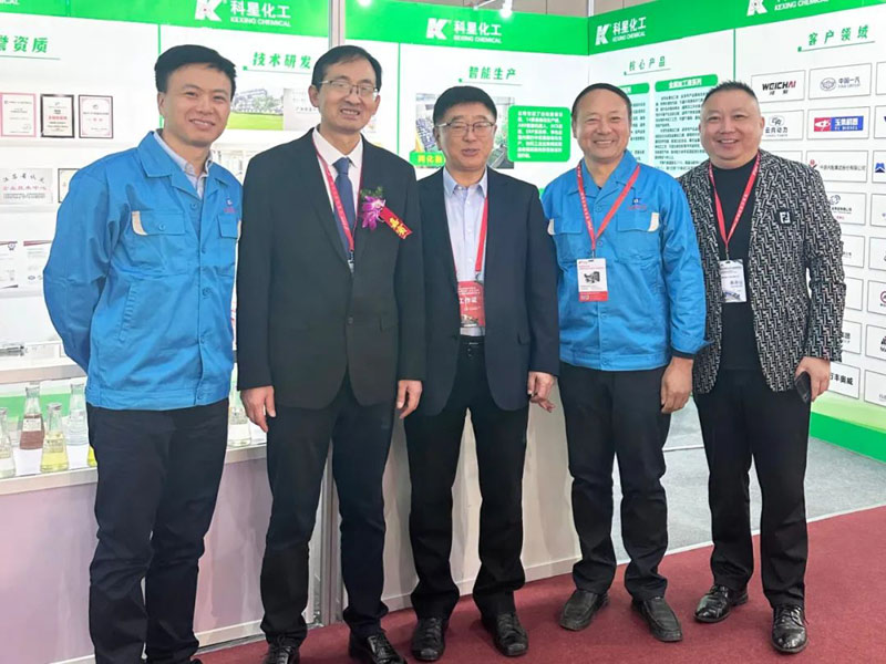 中國內燃機工業協會副秘書長沈彬(左二)、中國內燃機工業協會綜合管理部遲海濤(左三)蒞臨科星展位交流并與科星執行總裁吳曉強(左一)、銷售經理申遠俊(右一)、蔣忠余(右二)合影留念