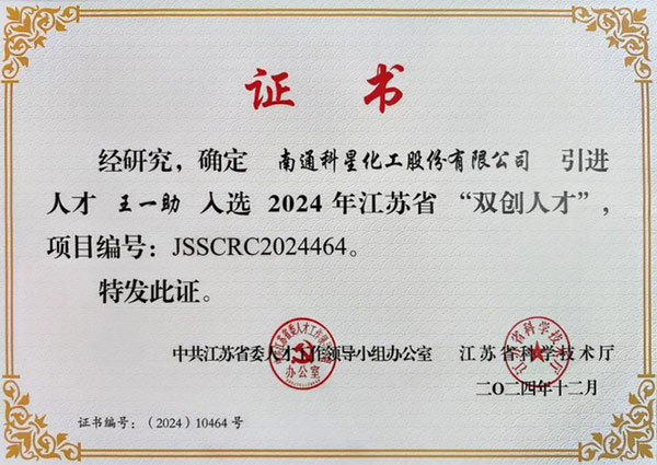 近日,經中共江蘇省委人才工作領導小組辦公室、江蘇省工業和信息化廳的多輪評審,2024年江蘇省“雙創計劃”結果已公布。南通科星化工股份有限公司“植物基金屬加工液”項目領銜人王一助總工程師榮膺2024年江蘇省“雙創人才”稱號!該項目突破性實現植物基替代礦物油,首批產品已實現產業化應用,較傳統金屬加工液產品COD降低50%以上,填補國內綠色金屬加工液技術空白,為我國高端精密制造低碳轉型提供關鍵化學技術支撐。
