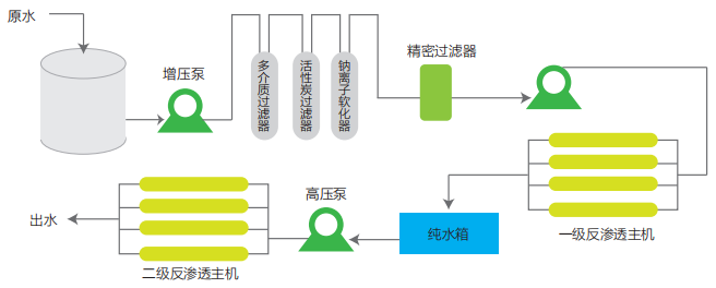 該設備在預處理階段采用多介質過濾器、活性炭過濾器、鈉離子軟化床去除泥沙、余氯、懸浮物、部分重金屬離子,通過精密過濾器攔截水體中膠體、小顆粒,經(jīng)過反滲透膜(RO膜)去除水體中絕大部分離子,脫鹽率可以達到98.5%以上,二級反滲透膜再次脫鹽,超純水電導率可以達到在5μS/cm以下。